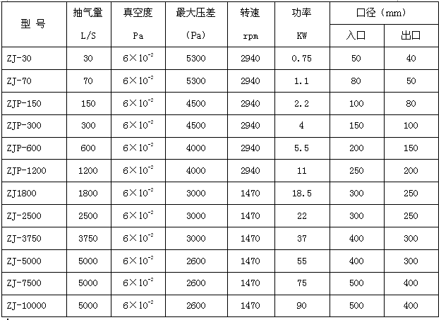 ZJ、ZJP系列羅茨真空泵最大的優點是在較低的入口壓力下能發揮出較高的抽氣速率,但是它不能單獨使用,必須與一臺前級真空泵串聯,待前級泵抽到一定的壓力后,羅茨泵才開始工作,這樣才是最經濟的。可以作為羅茨真空泵前級泵的真空泵很多,常見的有水環式真空泵、旋片真空泵、滑閥式真空泵等,配用不同的前級泵,羅茨泵能達到的極限真空也不同。